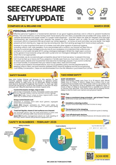 In the March edition of the See Care Share Update, we have a new refreshed and updated look and feel, one of the new areas is our Safety Share, where we are sharing some key learnings from our trending incidents that we have seen in the last month. The main update is in reference to our Personal Hygiene GHP which has been reviewed and updated in the last month, with some amendments to our jewellery policy and updates to the Food Safety Conversation that you can use to refresh your teams. Our take home safety this month is based around sleep awareness with it being World Sleep Day on Friday 13th March. So please share and encourage your teams to get involved and share with their family, friends and loved ones.